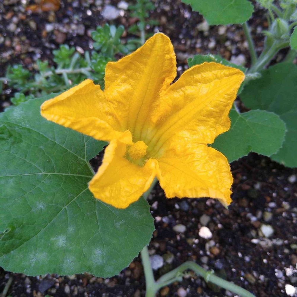 カボチャ大嫌いな長男に、「おもちゃカボチャ」ならいいだろうとメルカリで幼苗を買って植えつけたんですが、幼苗過ぎてうまく育たず😅今日開花していて、感動👀✨