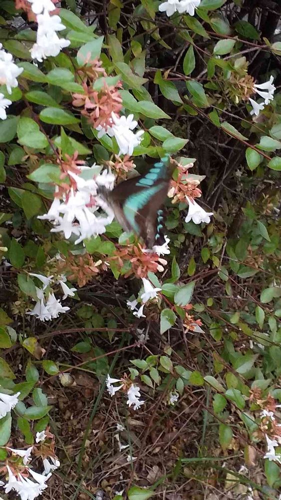 桜通りにて、アオスジアゲハが「アベリア」の蜜を吸っていました。🌼🦋