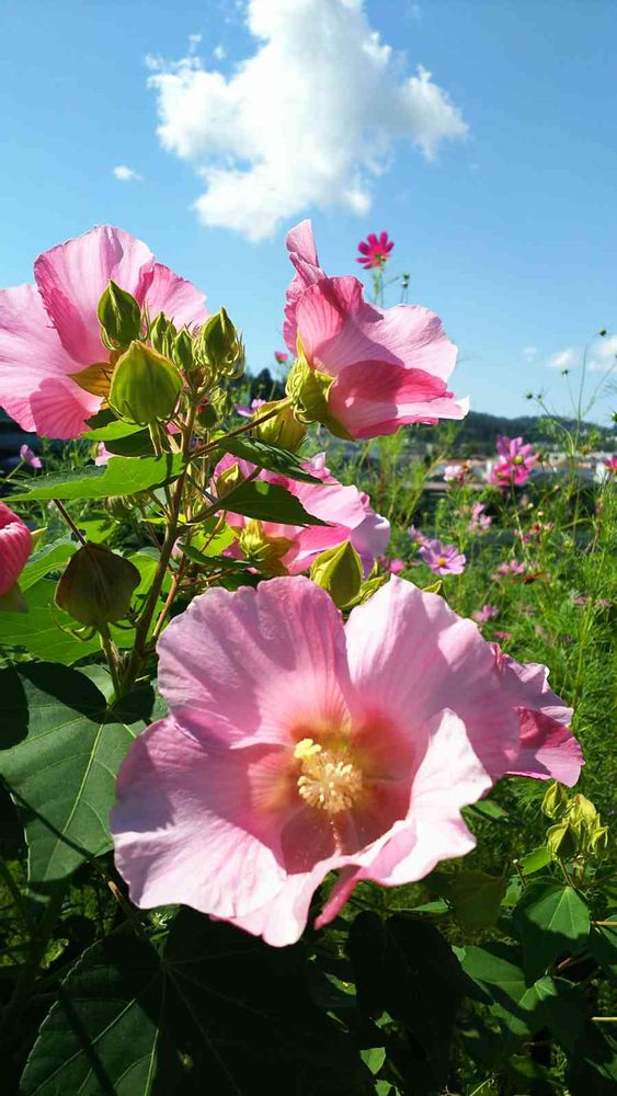 青空の下、ピンク色の芙蓉がとても鮮やかでした。