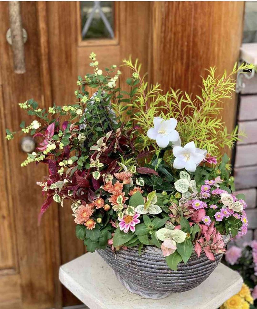 秋の花をふんだんに使って寄せ植えしました。ジニアがどんどん咲くそうです。
