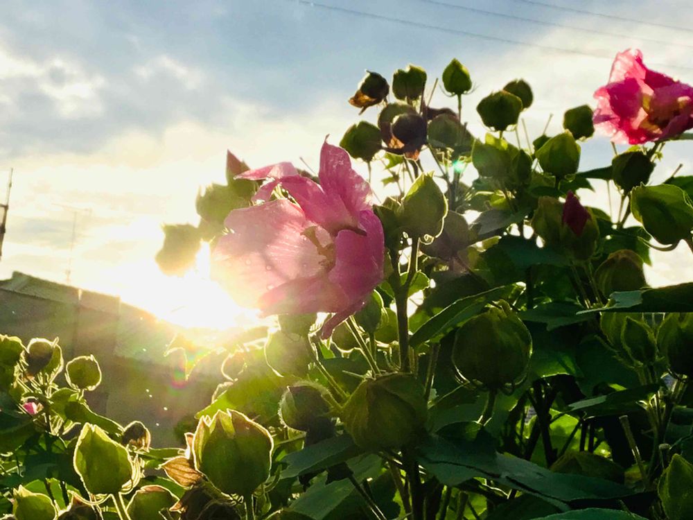 美しく開いたお花に夕日が当たっています😌。その下の蕾達にも当たっています😌。みんな上を向き、お日様からの暖かい光に喜び、感謝しているようです😌。お日様、お花が隣り合わせで対になり、その輪郭線上に、蕾たちが行儀よく成長し、お日様が見守っているようです😌。お日様といっしょのM.sionさん、暖かい心のこもったお写真ありがとうございます🙇🙏🌷🌱🌕💕😺。