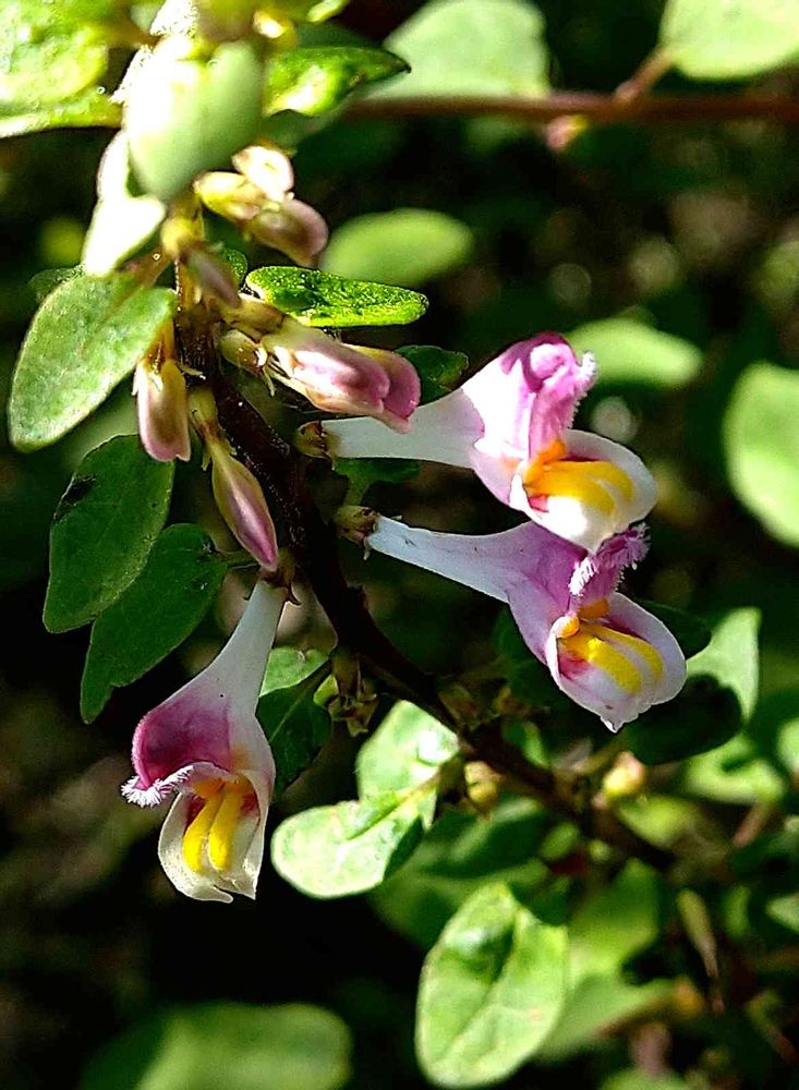 花の長さ1.5cm、唇形の花。下唇の基部が黄色で隆起