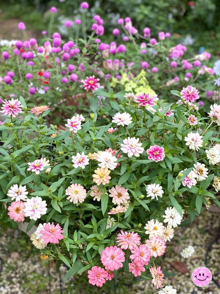 ジニアさんと千日紅さんもりもりで元気一杯ね。💕 お花の様に美しく元気に今週も頑張りましょう。🙋❤️