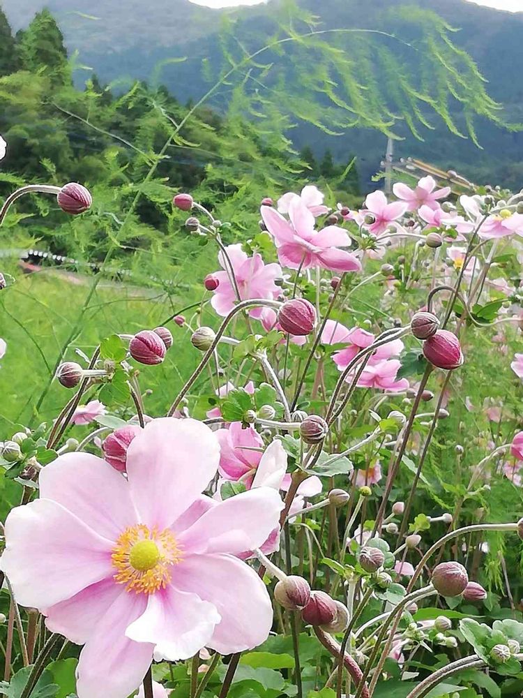 レモン愛花さん こんばんは😃🌃可愛いピンクの秋明菊、花壇植えなのですね。風景にマッチして綺麗だなあ🎵背景が山の高い所のように見えますね。気のせいかしら😅😅😅