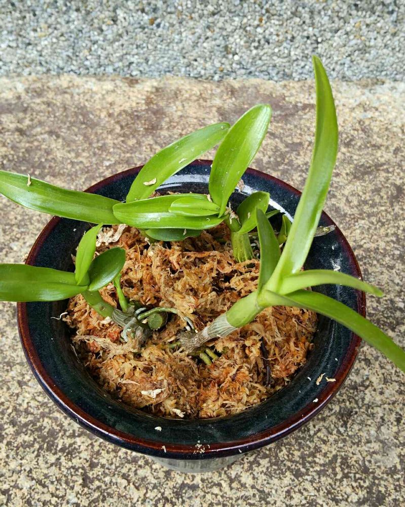 デンドロビウムのバルブから新芽と白い根が伸びていたので、バルブから切り離して、水苔に植付けました💕