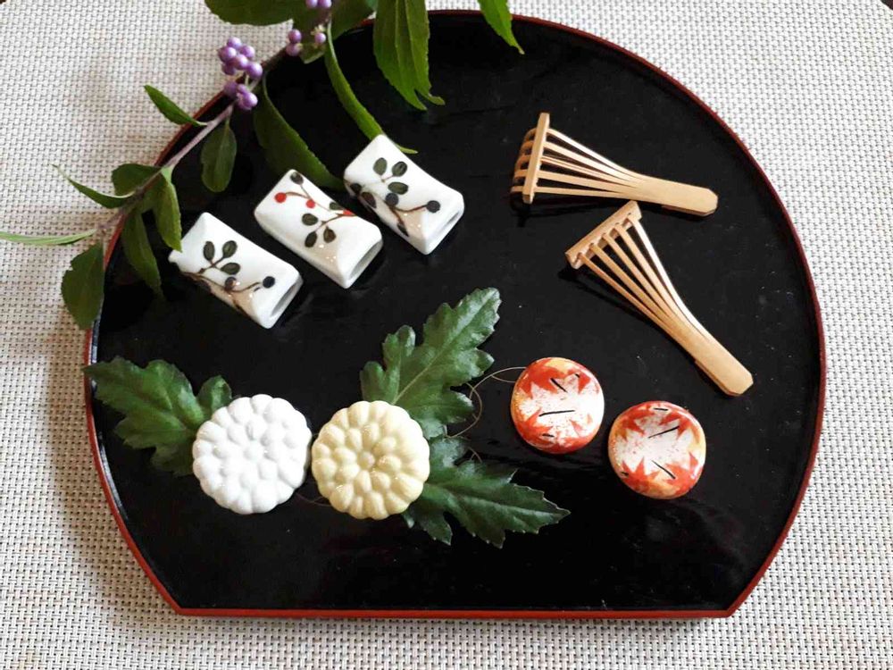 秋にちなんだ箸置きを並べました。左下白菊、黄菊は奈良の名店中川政七商店の物です。