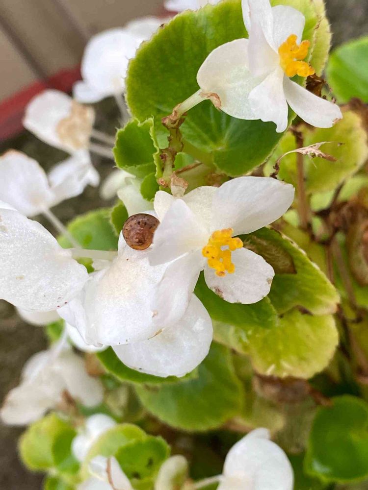 白いベコニアさんに乗っかる2ミリほどのカタツムリ🐌