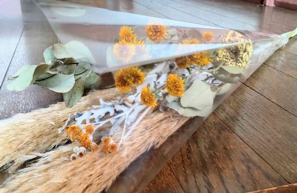 HCで前から欲しかったパンパスグラスを仕入れ(プロテアを前に買ってありました)、家のユーカリと黄色系(娘の黄色希望)の🌼ドライを手に下げて🚶