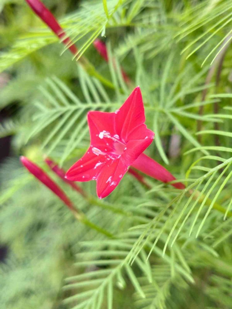 細い糸の様な葉に紅い漏斗形の花の縷紅草