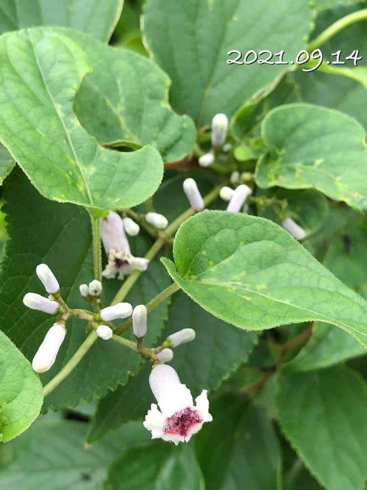 夏に中心部が赤紅色の白い小花を咲かせる。