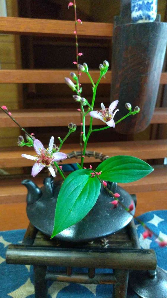ホトトギスとミズヒキソウ、お庭の秋をお部屋の中へ…素敵な取り合わせ!!活けていらっしゃるブルーの急須は民芸品?それともお台所から?…砂の道さんのセンスが光りますね。😄✌️❣️