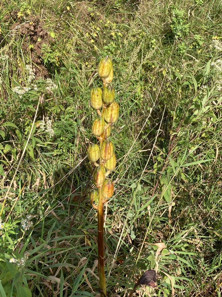 何かの実でしょうか?高さは1メートル位あります。名前が分かりました。オオウバユリ、別名エゾウバユリの実です。花が咲いてるところを見たかったです❗️