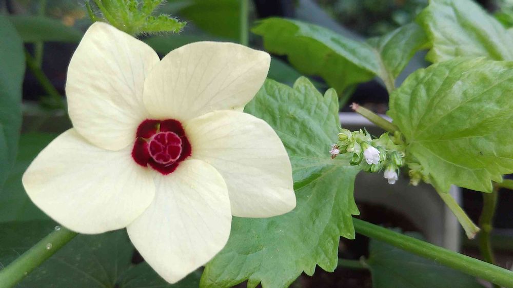 ベランダのプランターに咲いた小さなオクラと大葉の花の共演です