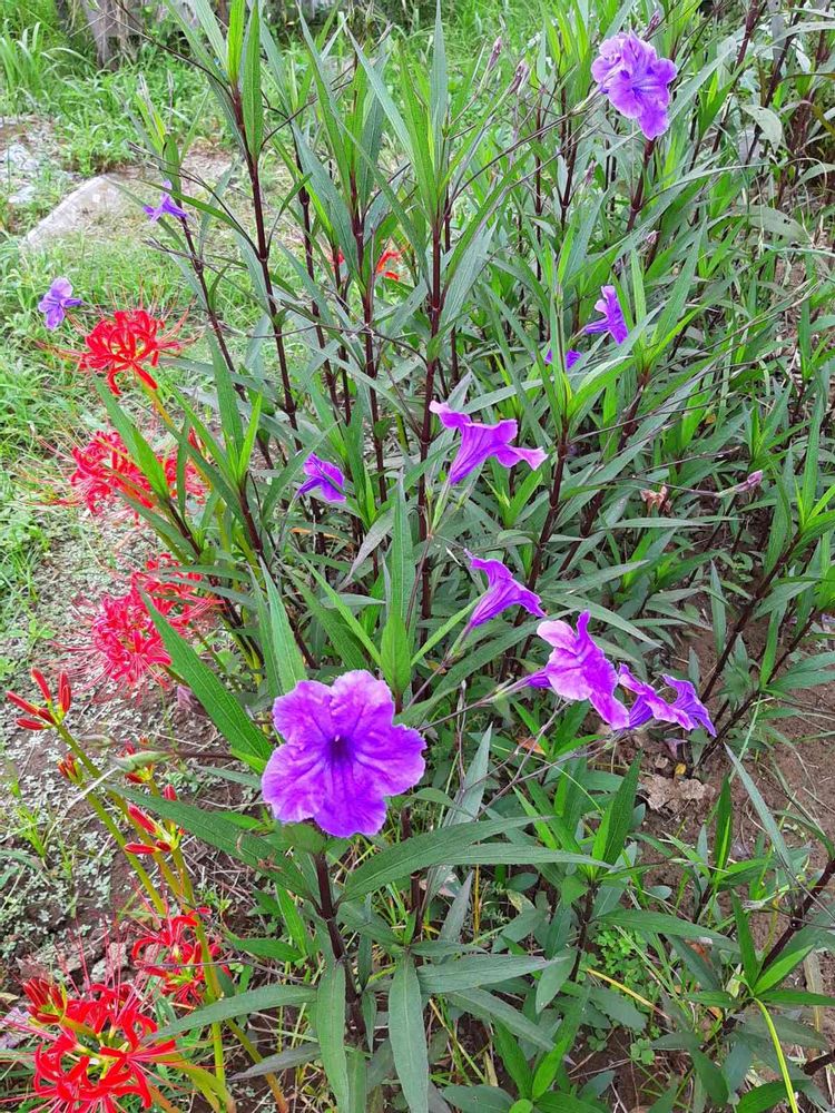 散歩道花壇に彼岸花と紫の花が咲いていました❤️💜