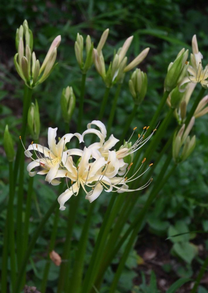 シロバナヒガンバナは、九州以南に散発的に自生するとのことですが、関東でも栽培されたものを見ることがあります。シロバナヒガンバナは、核型分析と外部形態の比較により、ショウキズイセン(別名ショウキラン)とヒガンバナの交雑種とされています。