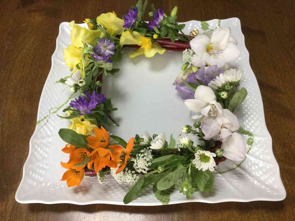 サンゴミズキでベースを作り、8種類の花材でリースを作りました。私は5種類の花材。
