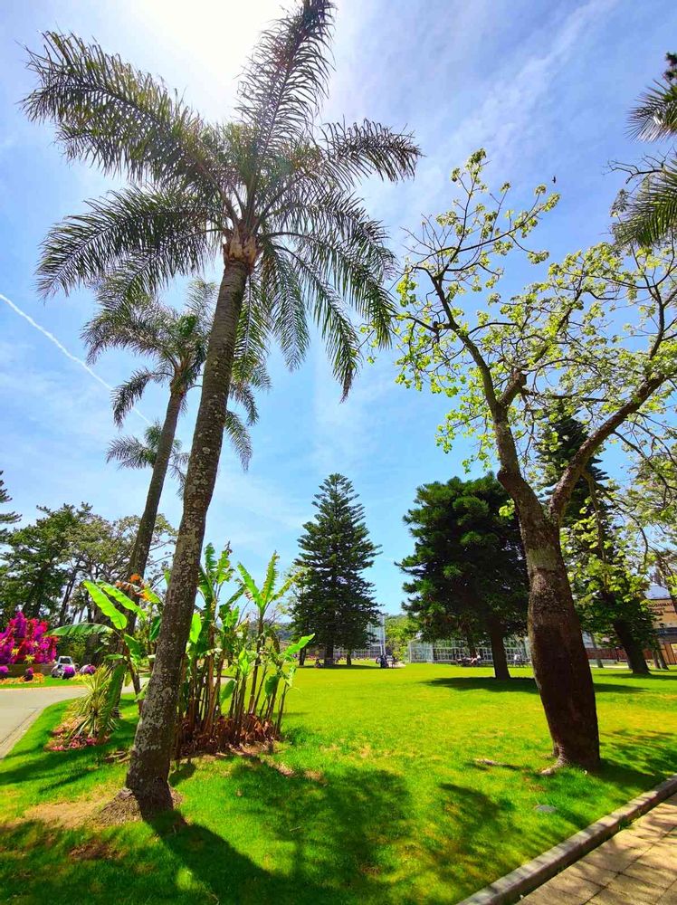 後ろにはナンヨウスギも見えますが、ジョオウヤシを始め17種類ものヤシが植栽されているらしく、溢れるような異国情緒が最高ですよね✨
