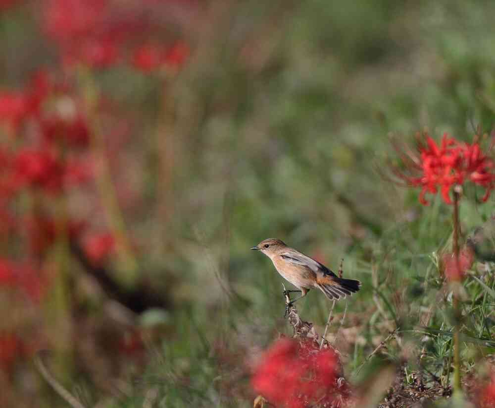 赤いヒガンバナにちょっと赤茶のノビタキさん、映えますねー❤️