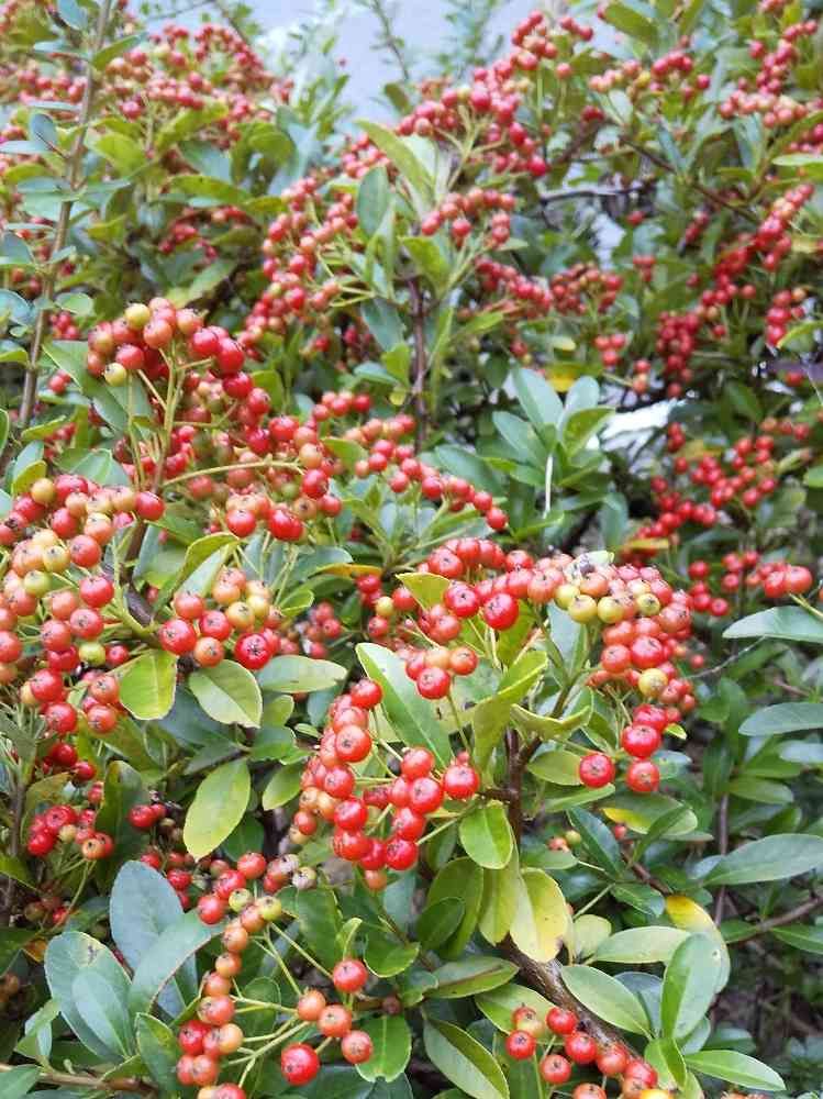 散歩道で木の実が赤く色付いていました。名前を調べてみるとカザンデマリ(ピラカンサ)でした。