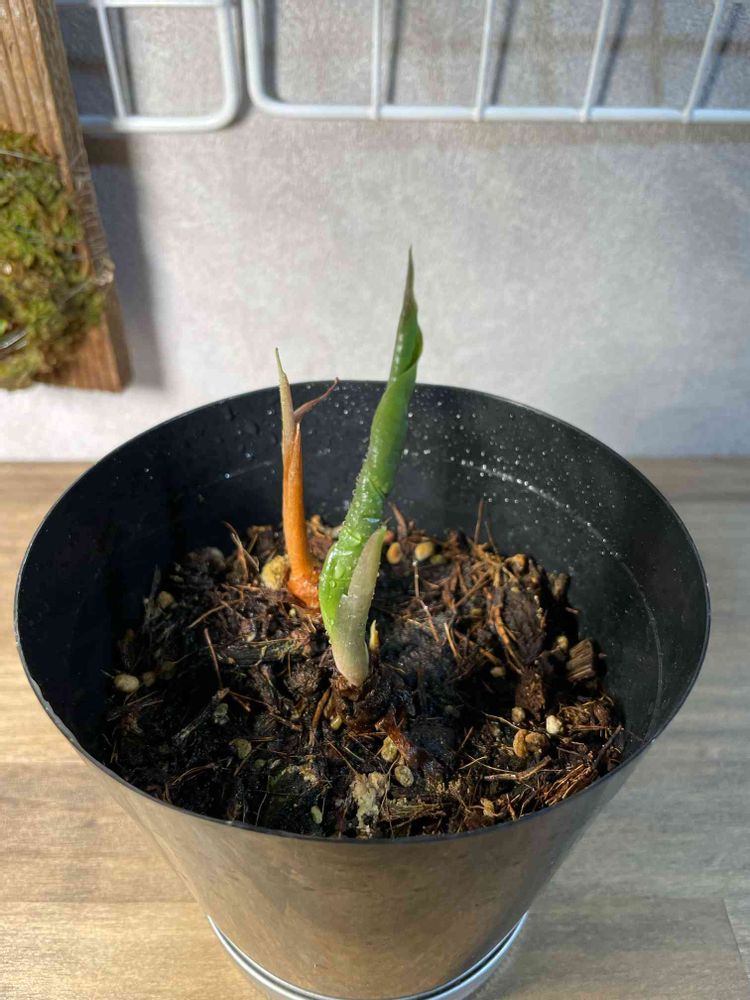 外管理していたアロカシア・アマゾニアが全枯れしてしまい諦めが入りながら水遣りしていたら新芽が出てきた🤩