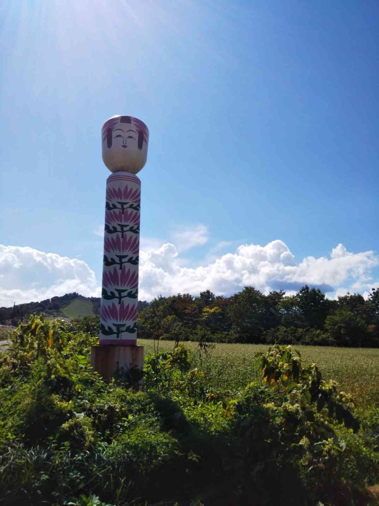 反対側の📱、肘折温泉はこけしも有名です。左奥は湯の台スキー場です。右側一面蕎麦の花ですが、📱💪悪く😔逆光のせいです🙇🙏