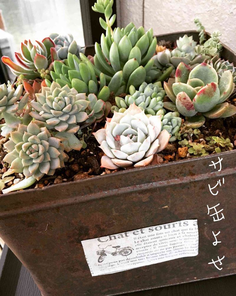 サビ缶は実家で母が捨てずに放置していたもので勝手に頂いたサビ缶です。今サビサビの物もが多肉さんにいい具合に会っていい感じですね❤️多分おかき缶は10年位前から放置していた物です!