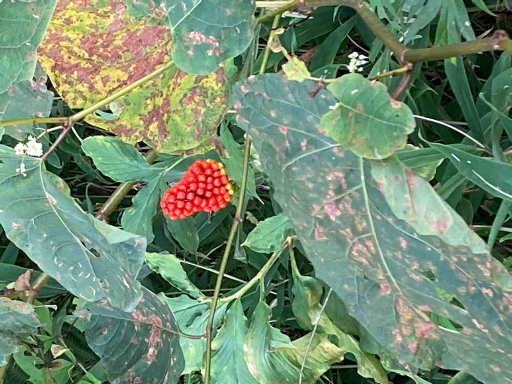 コウライテンナンショウの実です。調べて見ると別名マムシグサ、エゾテンナンショウ言うようです。