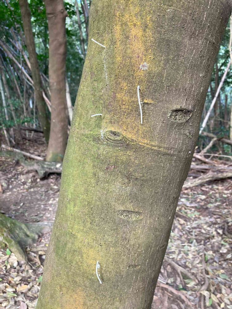 キノコだと、シロソウメンタケが 白くて細いみたいですが、木に 着くかは ❓️