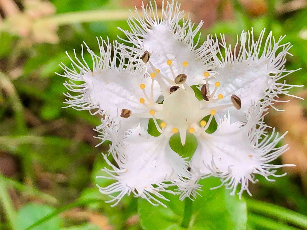 ひらひらフリルでとてもそう思えないんですが、茶色い葯を付けた雄しべの他に、花粉を出さない仮雄しべがあって、その先が細かく分かれて先端に丸い黄色い腺体を付けているのは、ウメバチソウと同じ。