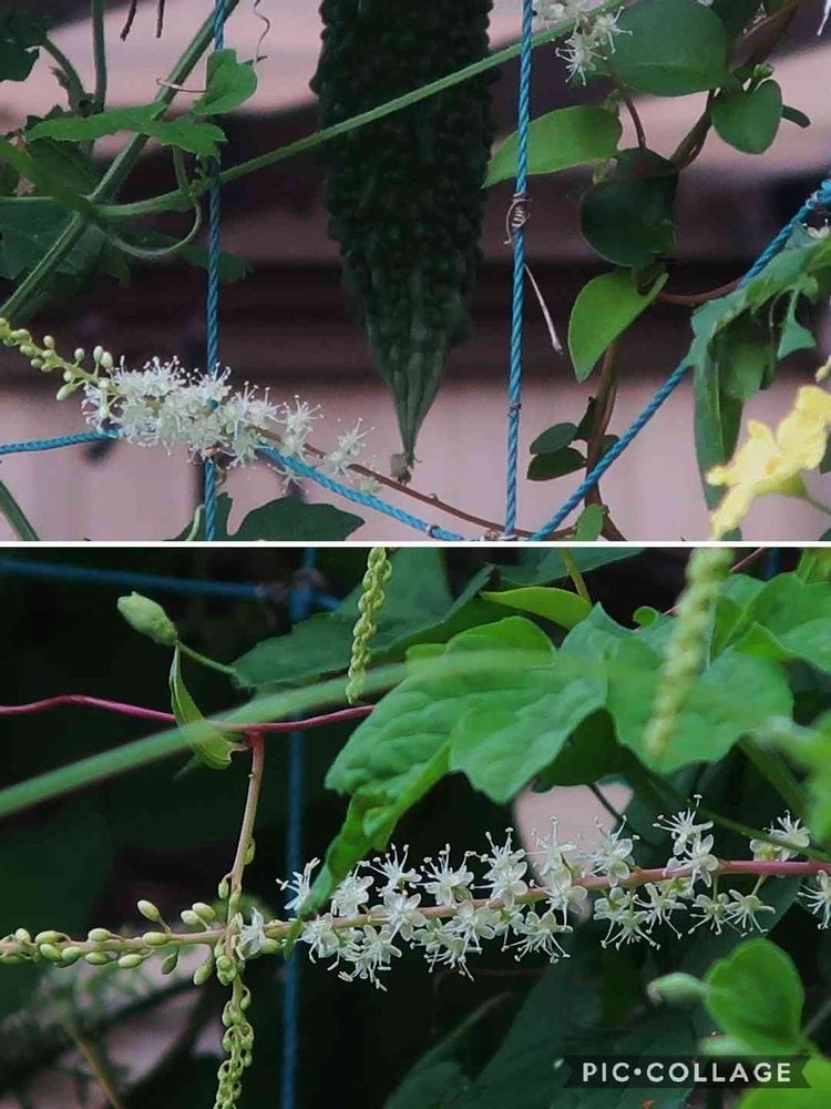 ゴーヤの前にある花。見たことある・・・去年、別の場所で見たオカワカメ(アカザカズラ)でした。