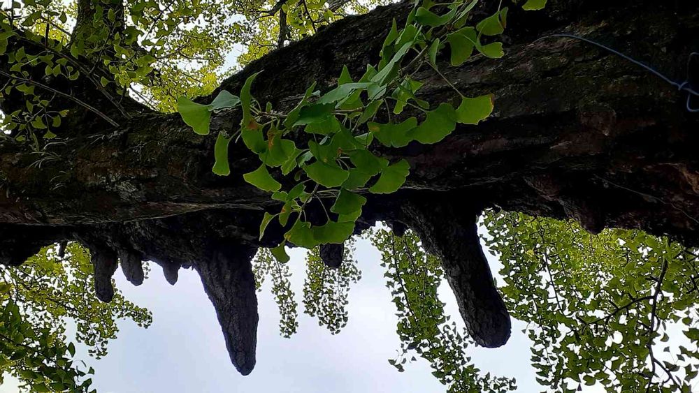 銀杏の木、横に枝が伸びていて⤵︎⤵︎に垂れているのが、