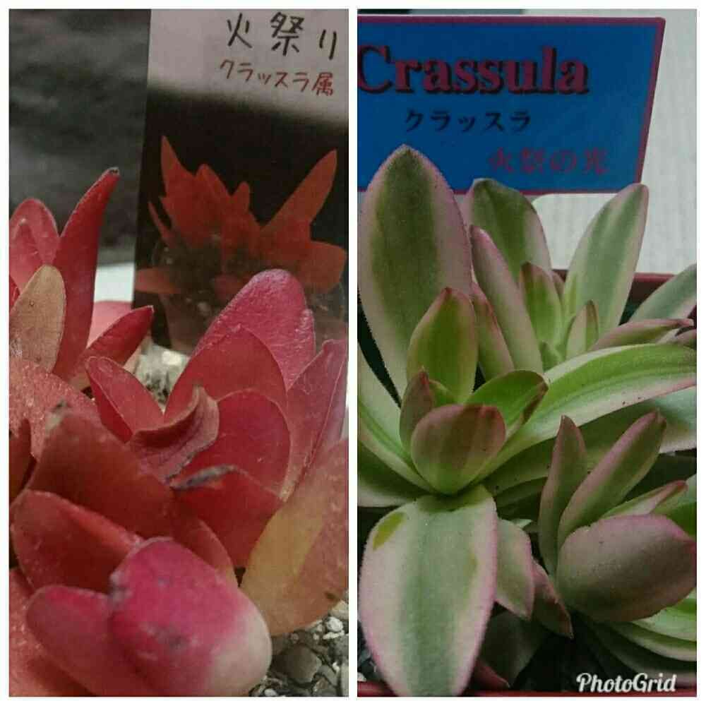 左の火祭さんは真っ赤ですが、光さんは斑入りです。