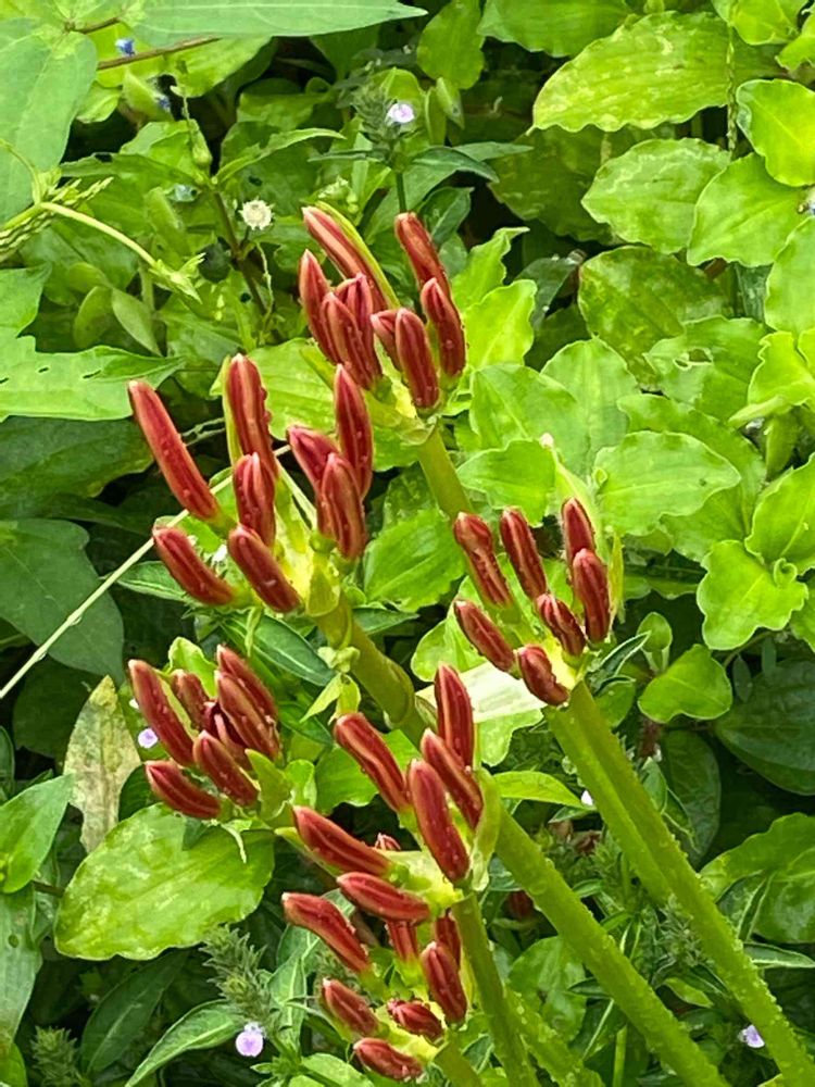 マルバツユクサとキツネノマゴをかき分けて顔を出したヒガンバナのつぼみ。
