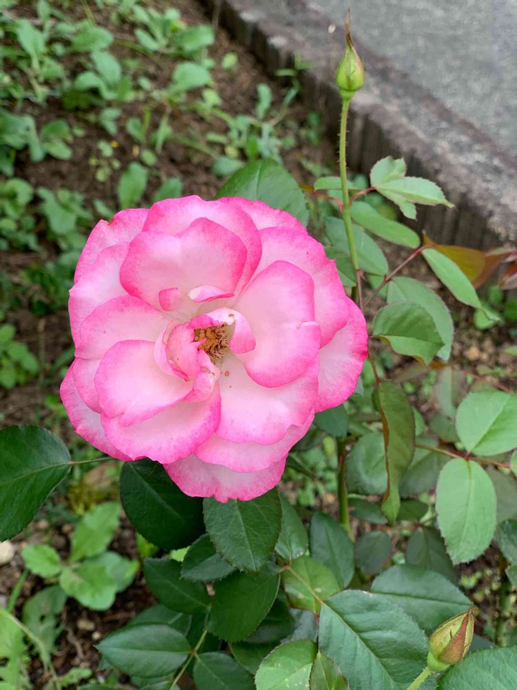 【迎え入れ】白にピンクの縁の可愛いバラ🌹蕾も三つ付けて楽しみです。