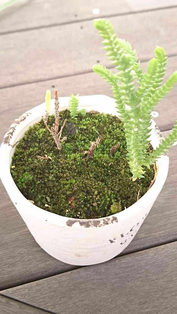 外に置いていた多肉植物。雨が多いのか、この鉢だけコケが良い感じになってきました。