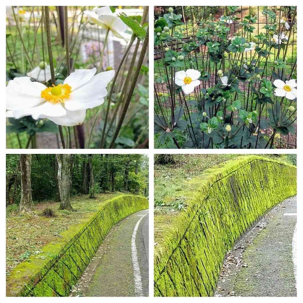 秋明菊の白、葉っぱと苔の緑色の濃淡🍀とてもマッチ💗しています。