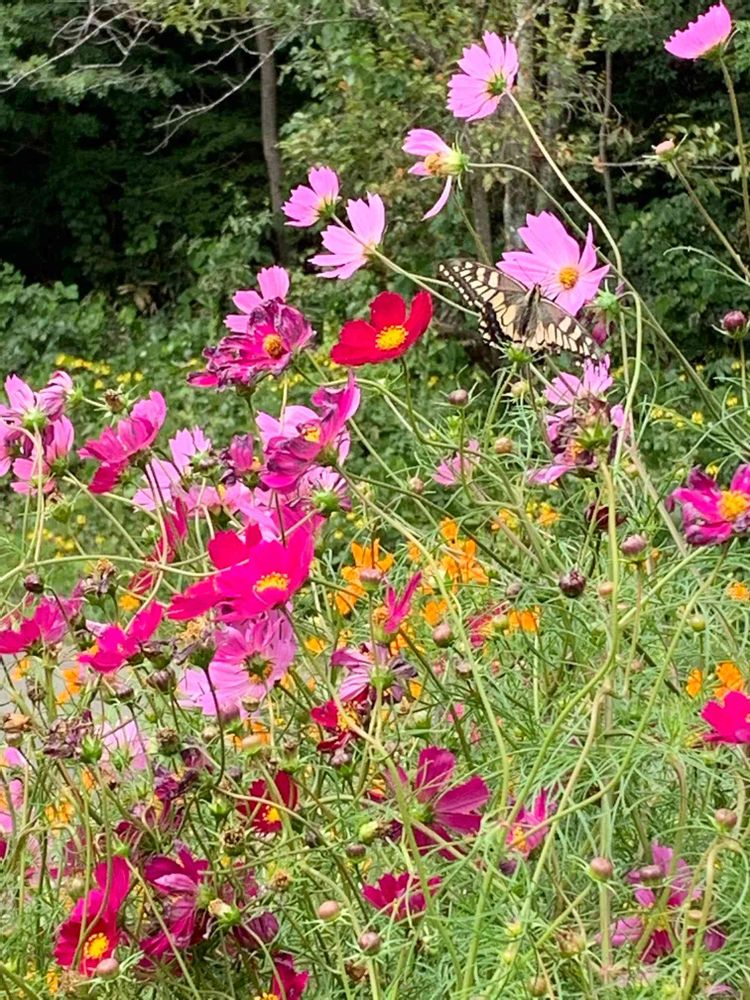 やっぱアゲハ🦋も 美しさに 我慢できなかったのでしょう🥰色とりどり「・_・ )(「・_・)"キョロキョロコスモスの色見本の様で 🥰