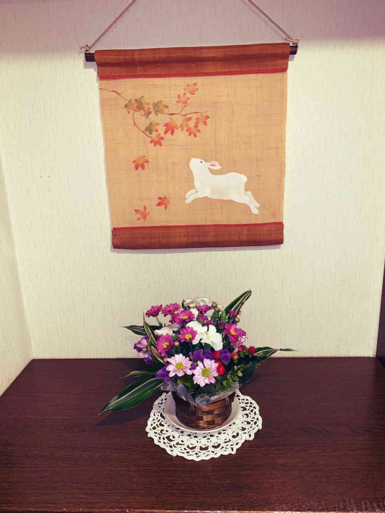 【中秋の名月】は来週の21日なので、紅葉🍁と🐰兎さんが描かれているタペストリーを出してみた😁