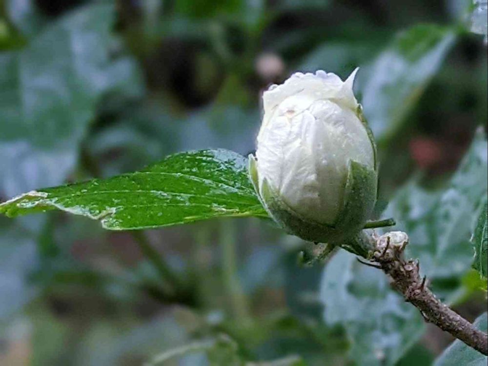 白い八重咲きの木槿です。今晩これからの台風でも明日無事に咲いてくれますように…。