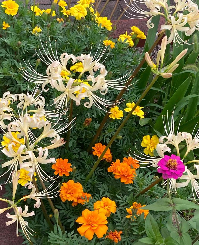 白い彼岸花🤍、黄色とオレンジ色のマリーゴールド💛🧡、ピンクのジニア💗と