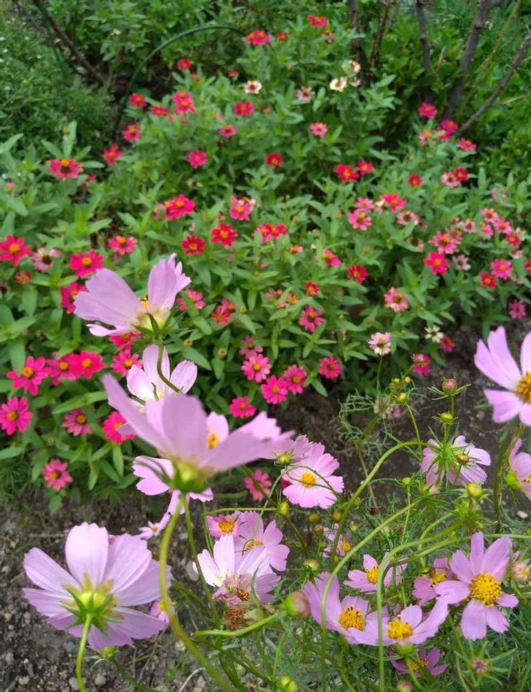 ジニアと秋桜がたくさん咲いて、自然の風景のようですね🎵