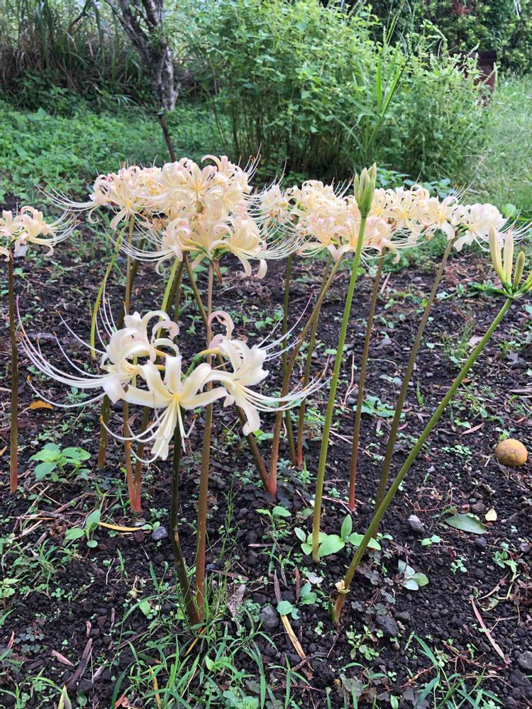 昨日の雨で彼岸花が一気に咲き始めました.色はクリーム色です。