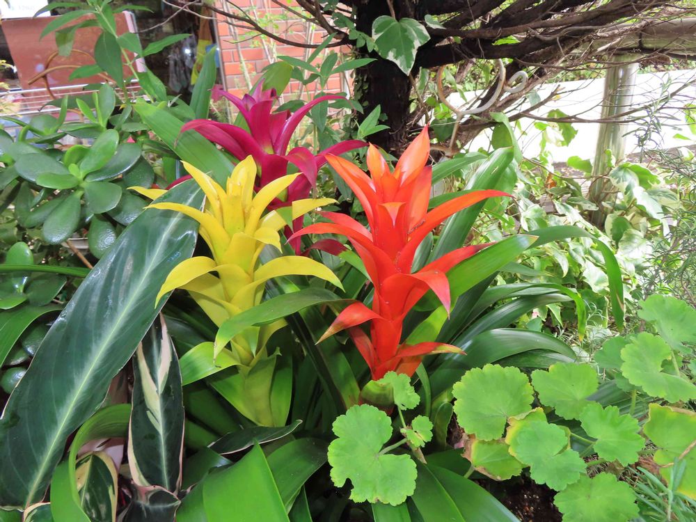 いつもチェッしていた植え込みに、新たなお花? 「グスマニア」がお目見えしました。 パチリ