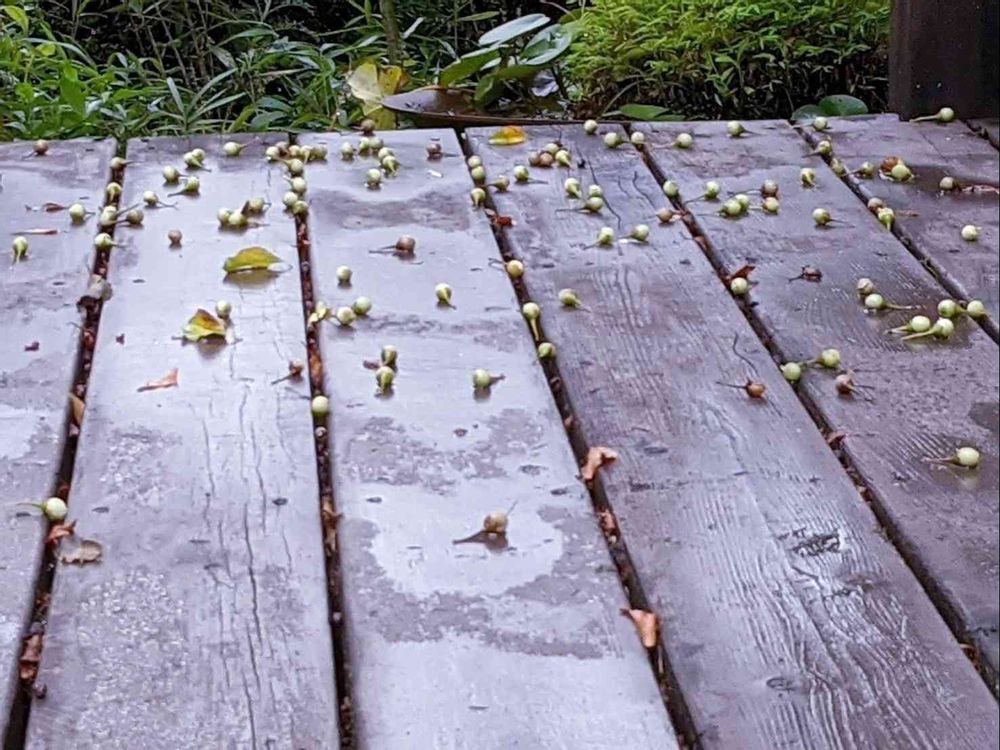 昨夜かなり強く降ったらしく、デッキの上にエゴの実が沢山落ちていました。