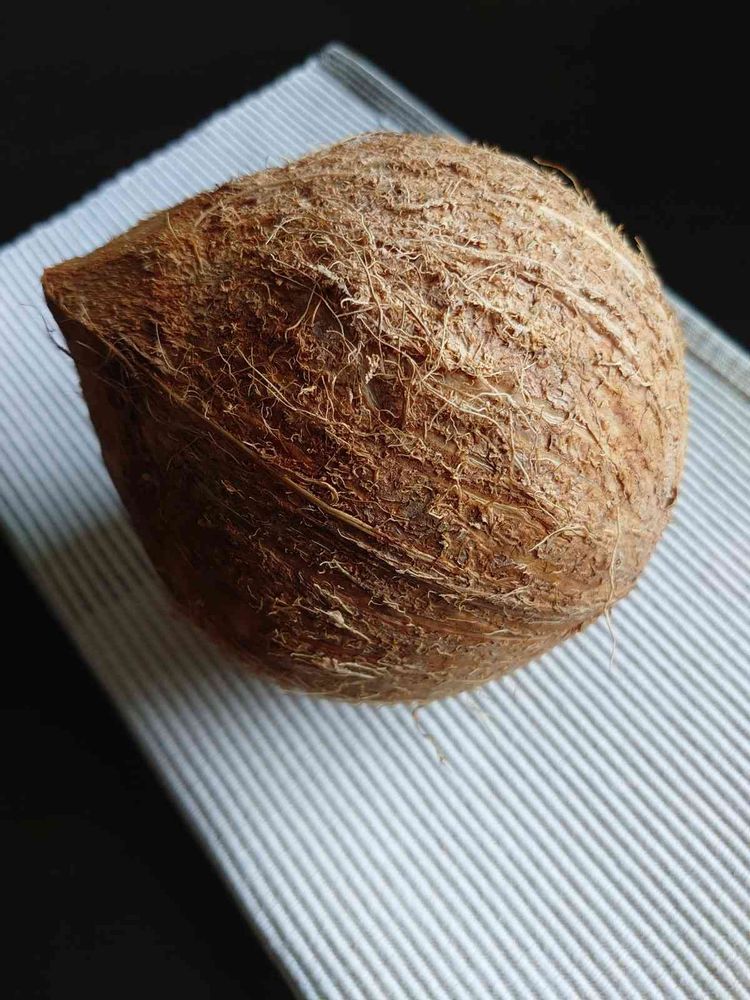 外皮(ココナッツハスク)を剥いだ状態のココナッツ。普通、こういう状態で売ってるし、こういう状態でもらいます。🥥