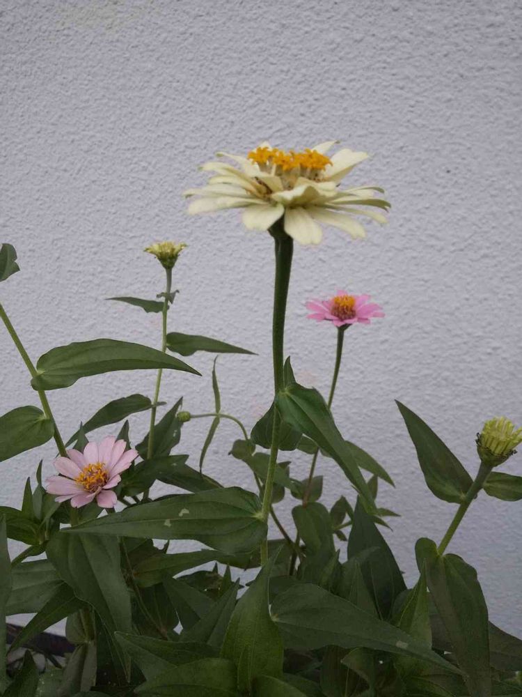 白い壁に…色とりどりのジニア…さん…優しい色合いがなんとも!夕日に生えて…美しきかな…(*˘︶˘*).。.:*♡💛🤍🌸🤍💛🌸🌱🌿
