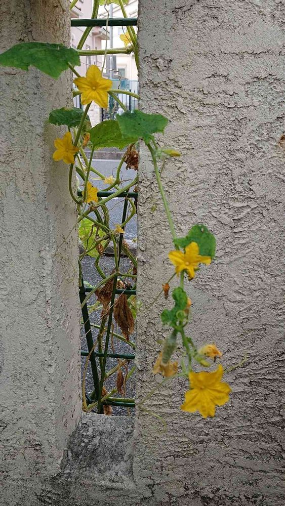 花壇で育成中の「ミニ胡瓜」。仕切りの窓からこんにちは🎵。