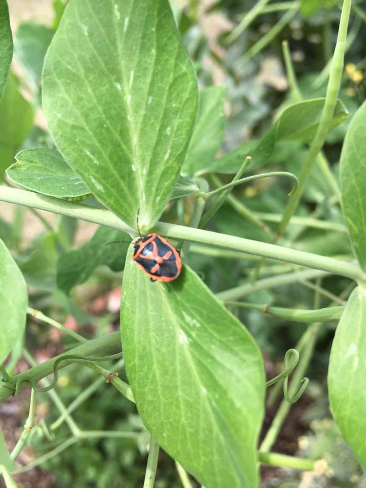 カメムシの一種、ナガメだって。私の大事なスナップエンドウちゃんに何してくれんの!と思ったら、アブラナ科の植物の汁を吸うんだって。ナバナの方だったみたい。カメムシって、草食系と肉食系があるそうで、多分皆さんも一度は見たことがあるサシガメが肉食代表。友達曰く、蜂に刺されるぐらいの痛さだってヨ、コワ(o_o)でも、イモムシとか取ってくれるから益虫でもあるんだって‥