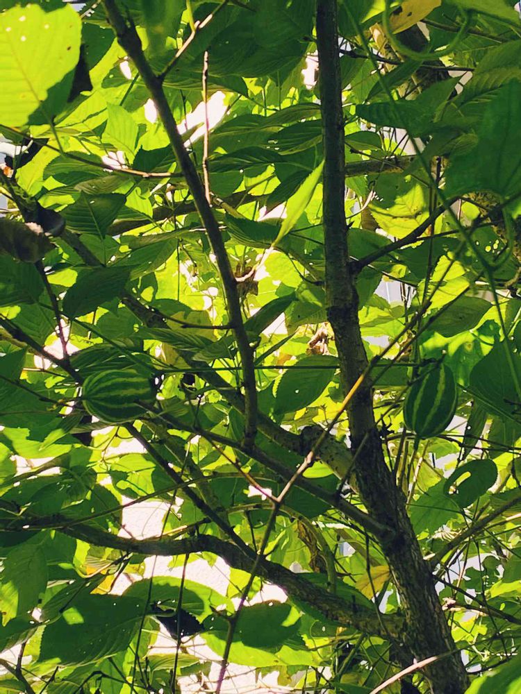 お向かいの家の木に絡まっているツルをよく見たら、スイカみたいな実がなってました🤣
