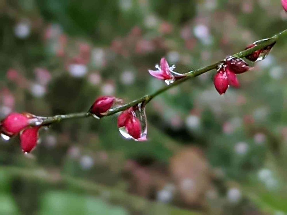 昨日朝、雨降りの中の赤い水引草です。雫を纏って、お祭りの夜店のツヤツヤのりんご飴を思い出しました。🍎